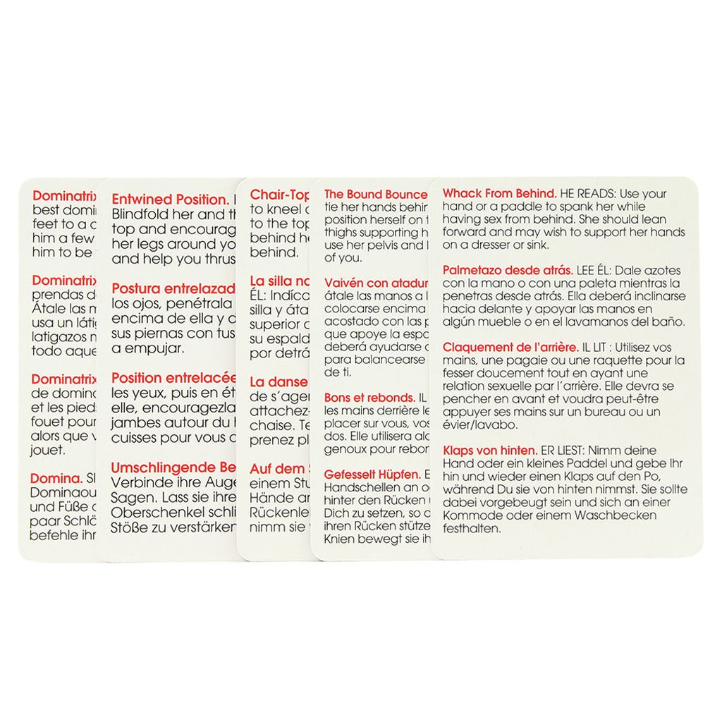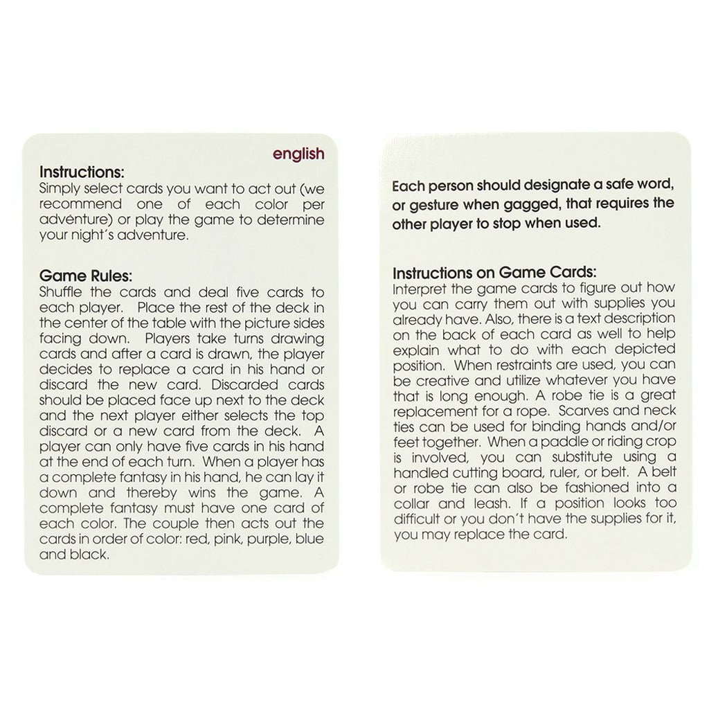 To play, you’ll draw cards, deciding along the way which to keep and which to discard. The goal is to rack up one of each color card- the resulting hand will spell out a bondage-bent scene that can be reacted with favorite bondage gear, or more readily available household items. Instructions and tips included.