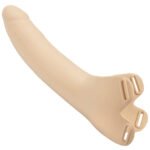 The Accommodator’s concept is simple. A pseudo-lifelike shaft is backed by a double strap that loops around the back of the neck and over the back of the head. The dildo sits at chin level, so when its wearer is going down, it’s in a penetrable position. Strap it on and play away!