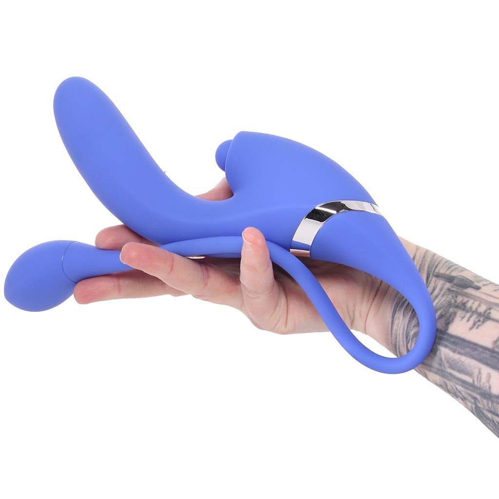 Up top, All In’s main penetrator is smooth and rounded for comfy insertion and easy sweet-spot seeking. Below, there’s a tapping outer stimulator for sexy thumping sensations, and below that is a sexily swollen anal probe on a long, flexible tail. TLDR: All In was built for maximum sensation inside and out.