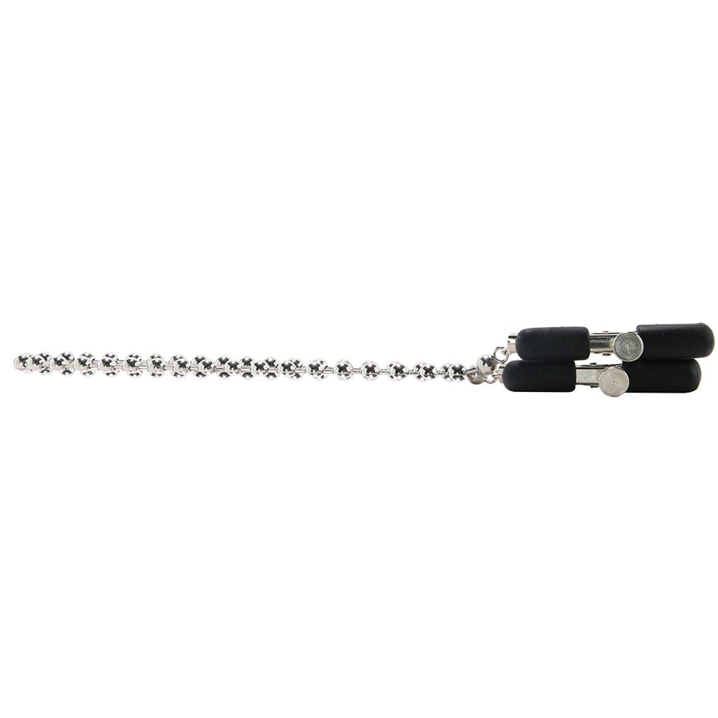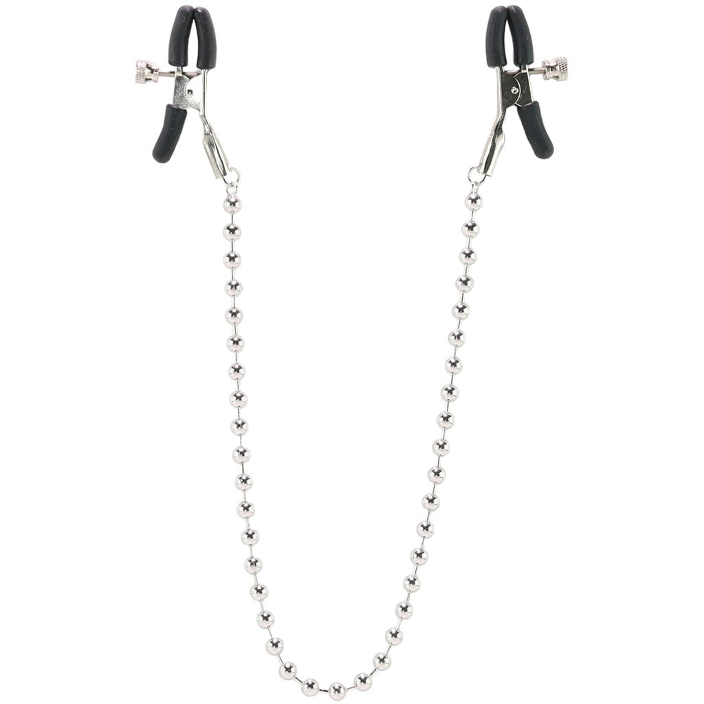 Tugging and teasing sensitive flesh while dazzling with silvery beaded styling, this classic chained clamp set from CalExotics applies pleasurable pressure to nipples and beyond, keeping up an unrelenting pinch for long drawn out stimulation.