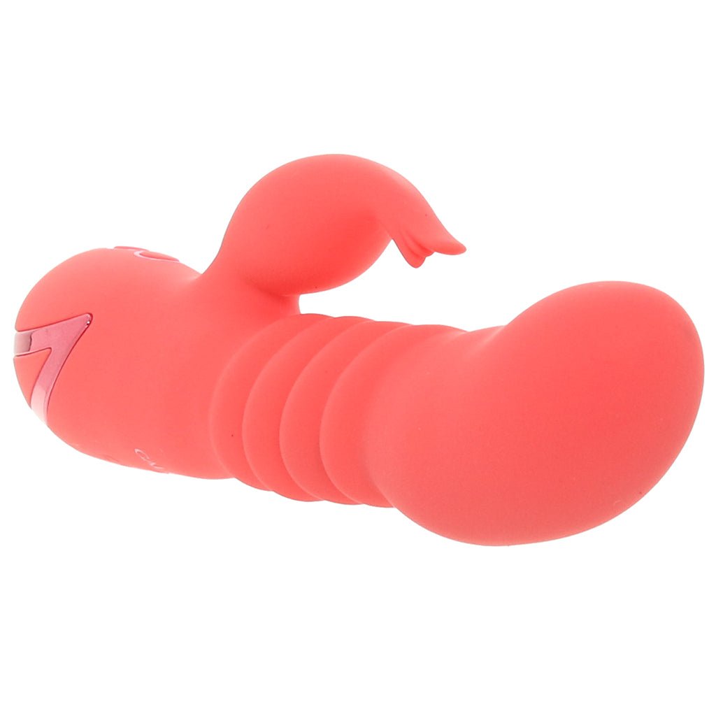 This thrusting rabbit vibe is built to whisk you away to your happy place. The curvy, forward-tipped penetrator dives straight toward your hot spots while the soft external teaser flutters below. With three speeds of thrusting plus ten vibration modes (yep, they run separately), you get to mix, match, and ride the wave however you like.