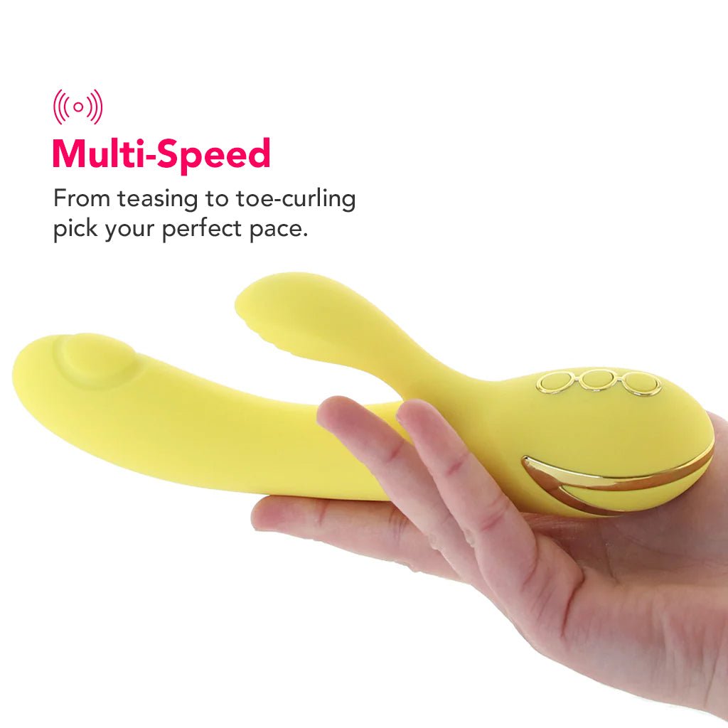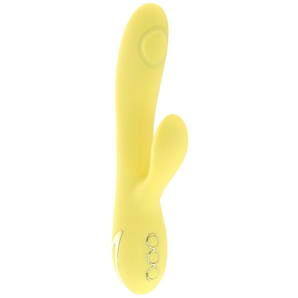 Swollen up top and featuring three speeds of thumping gyration in its sunny yellow shaft, San Diego Seduction will make some seriously sexy waves when it comes to g-spot (or prostate) and inner erogenous zone stimulation. Embedded in the up-curled clitoris (and beyond) stimulator, ten modes of gyrating vibration will captivate any outer sweet spot that happens to be in close contact. Enjoy vibration and tapping together or separately, a simple 3 button interface controls all.