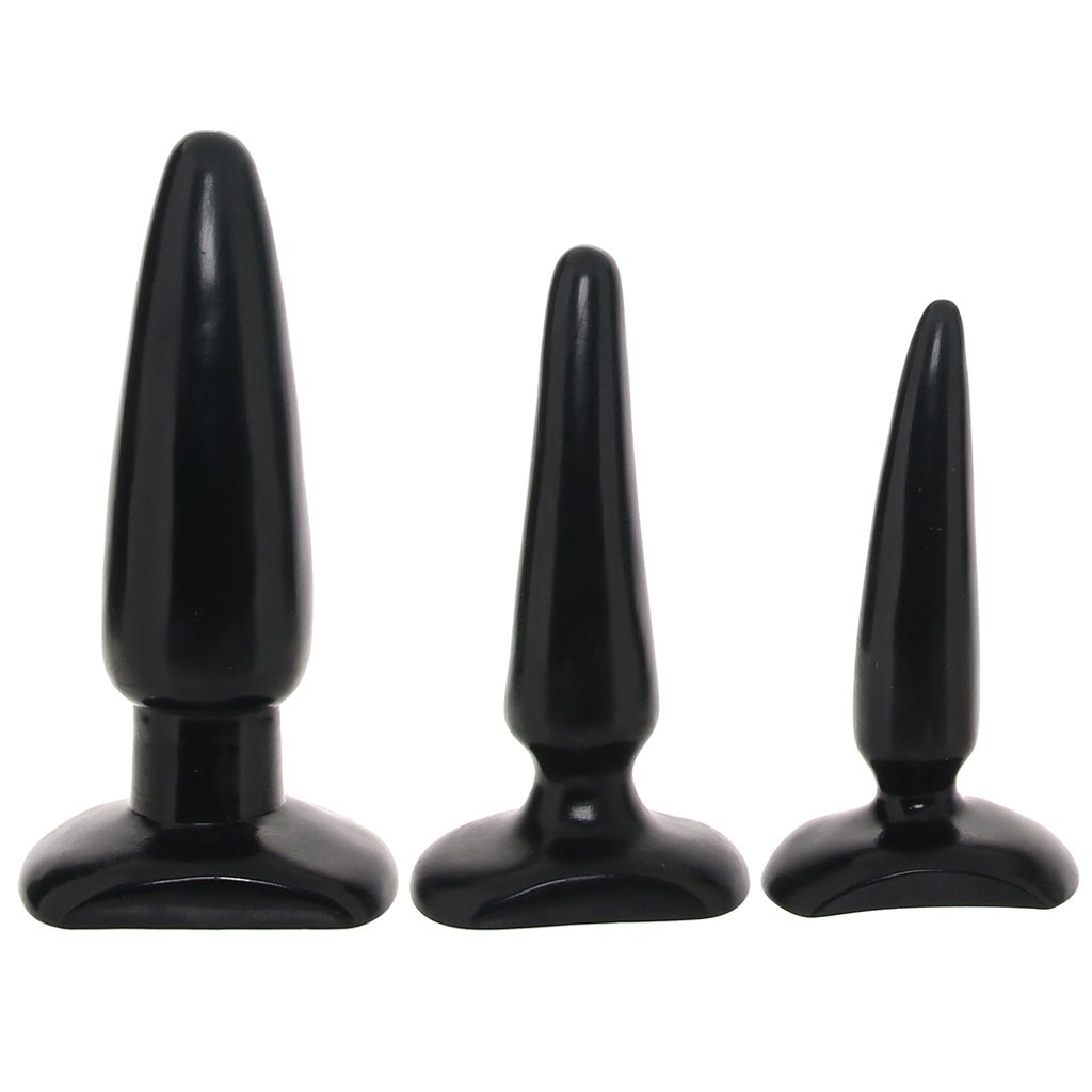 This trio of classic PVC plugs starts off small and ends large, letting work your way up. Each is firm and easy to control with a big, safe wide base, while being pliable enough to position perfectly. Use a good water based lube with the Kit, and enjoy!