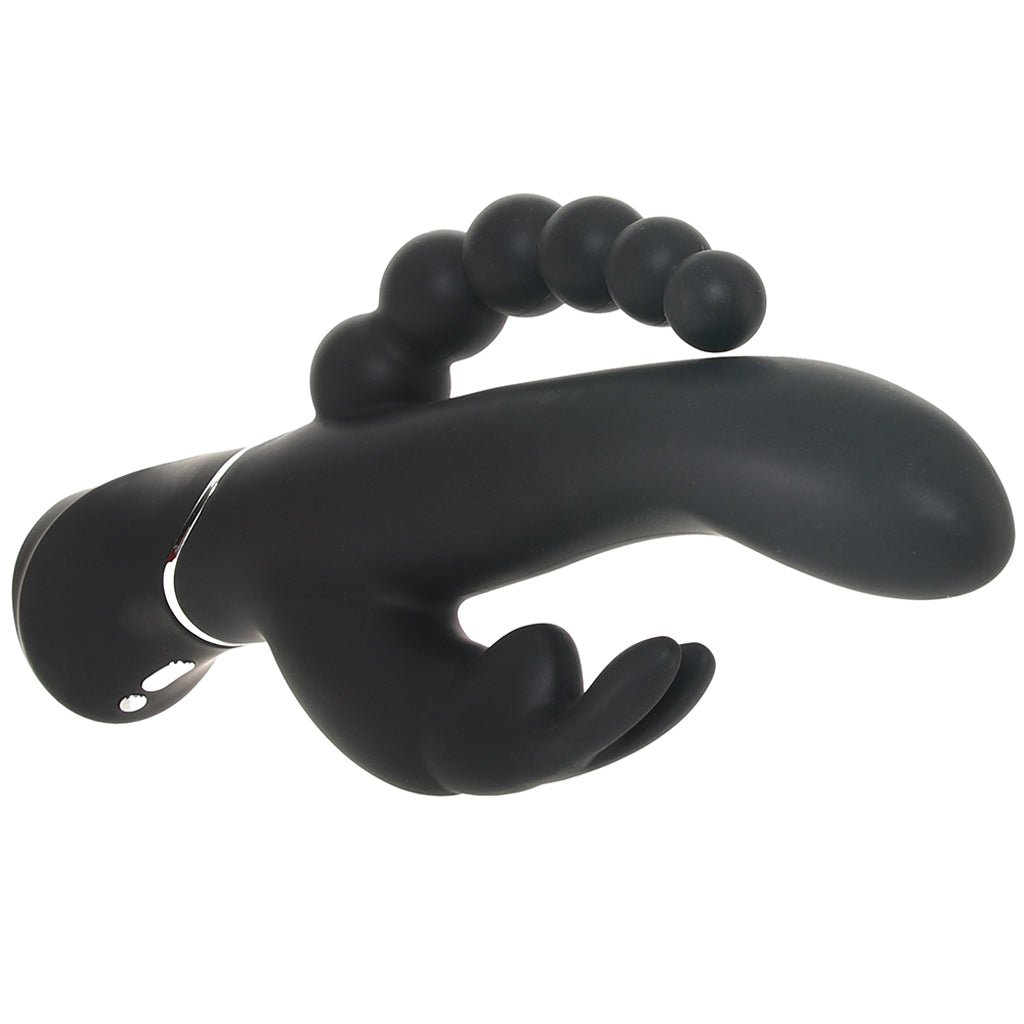 Up top, the black silicone Triple is smooth, tapered, and curvy, all the better for targeting G-spots, A-spots, and inner hot spots generally. Meanwhile, the flexible bunny teaser and beaded butt tickler reach up to buzz and throb against and inside outer pleasure places.