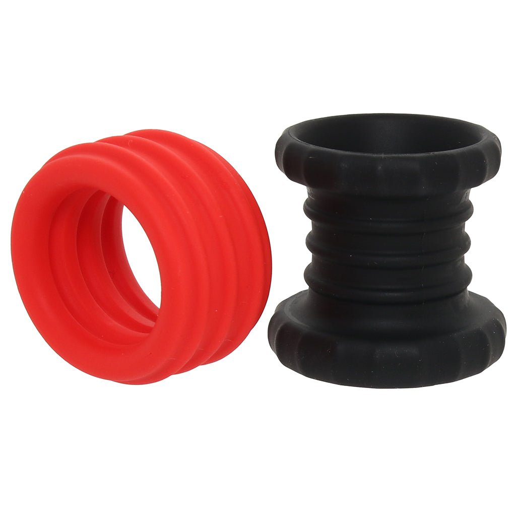 Use them solo, stacked, or together for different kinds of squeeze: red for your shaft, black for your balls, or both for a snug ball-stretching grip that’ll keep you buzzing.