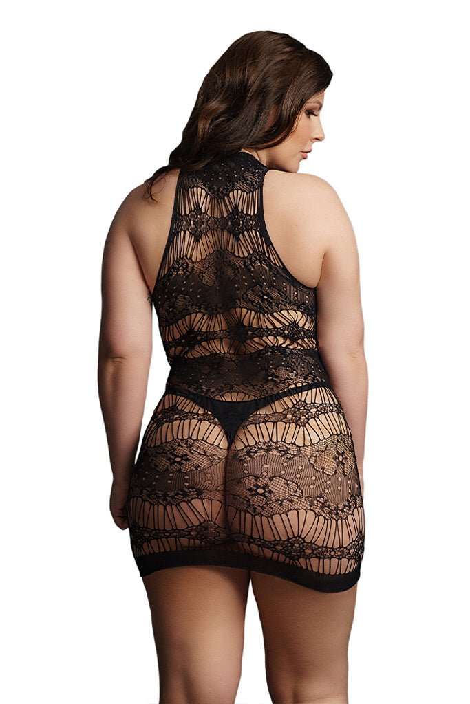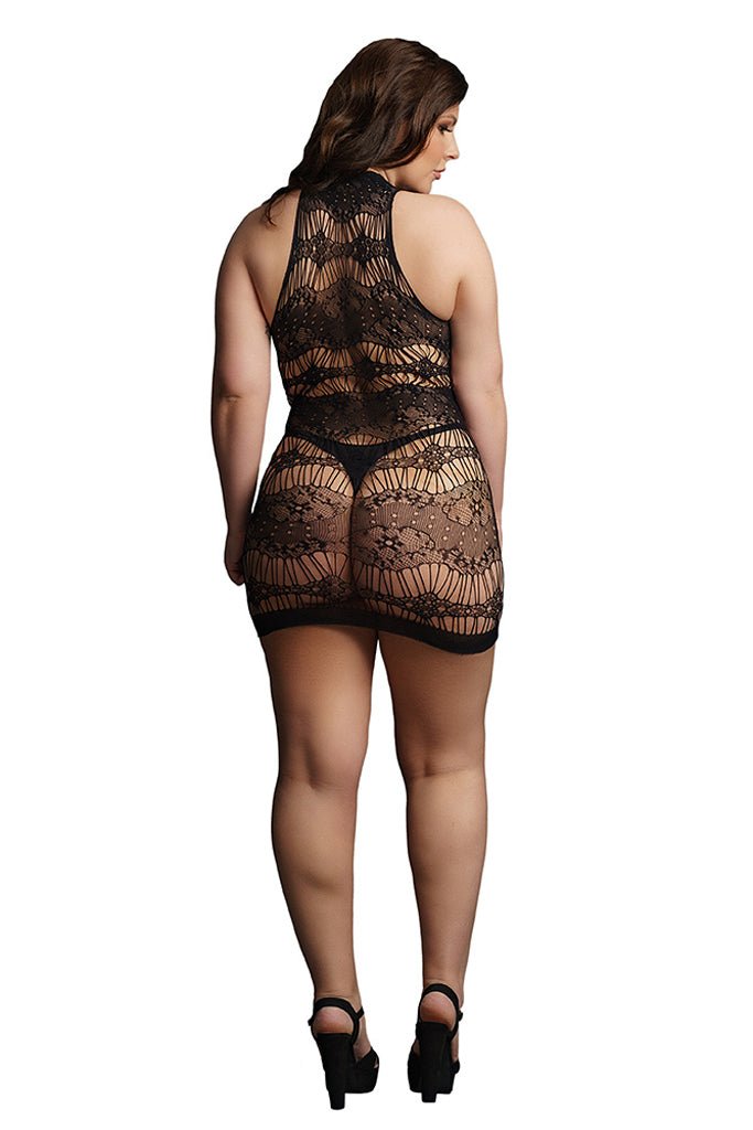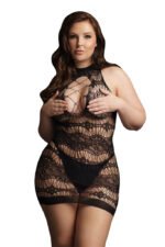 This black criss cross mini dress is crafted from a mix of lace-pattern and shredded material. It features a very sexy cleavage with criss cross keyhole neck line. One size fits most curves. Thong not included. Hand wahs cold, line dry. Never iron, bleach or dry clean. 92% nylon, 8% spandex