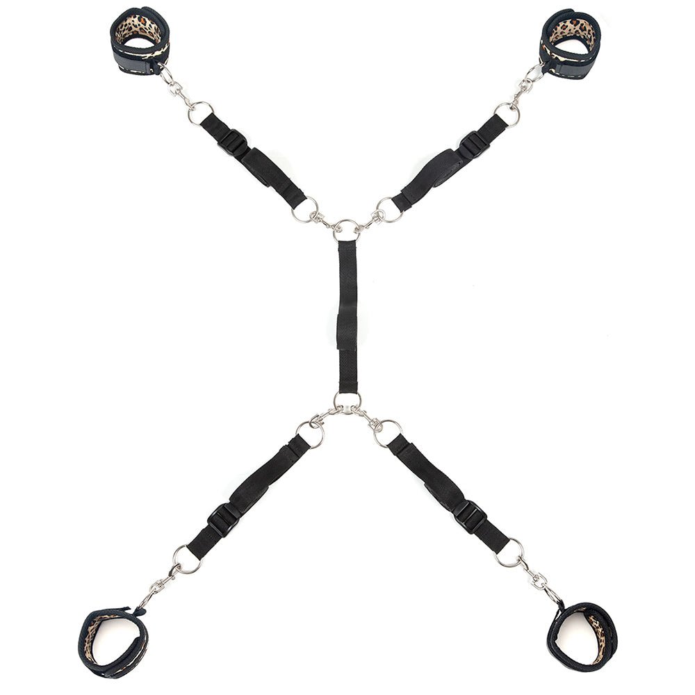 Allowing for all kinds of connectivity with cuffs, tethers and otherwise, the Spreader set contains four adjustable straps and a midpoint attachment band that slip discreetly underneath (or around) bed configurations, attaching, in turn to four (two for wrists and two for ankles) included leopard print velcro cuffs with sturdy swivel clips. Connect the cuffs to O-rings attached to each strap, and play away!