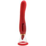 When you first un-box your Ultimate Pleasure, you’ll find four pieces, a luscious red silicone vibe with a bright pink tongue at one end and a smooth curve at the other, two silicone-edged suction cups and a teasingly textured tongue-shaped sleeve.