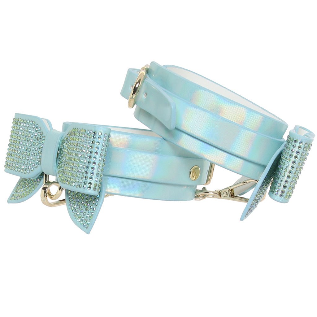 In shimmery vegan leather with dainty bows and sparkly crystal accents, these classic cuffs will circle your/their ankles oh-so-securely, holding legs immobile and at a partner’s (consensual!) mercy. Sturdy metal O-rings act as a hook-up point for the included connector, or you can use your Cuffs with compatible bondage gear you already own and love.