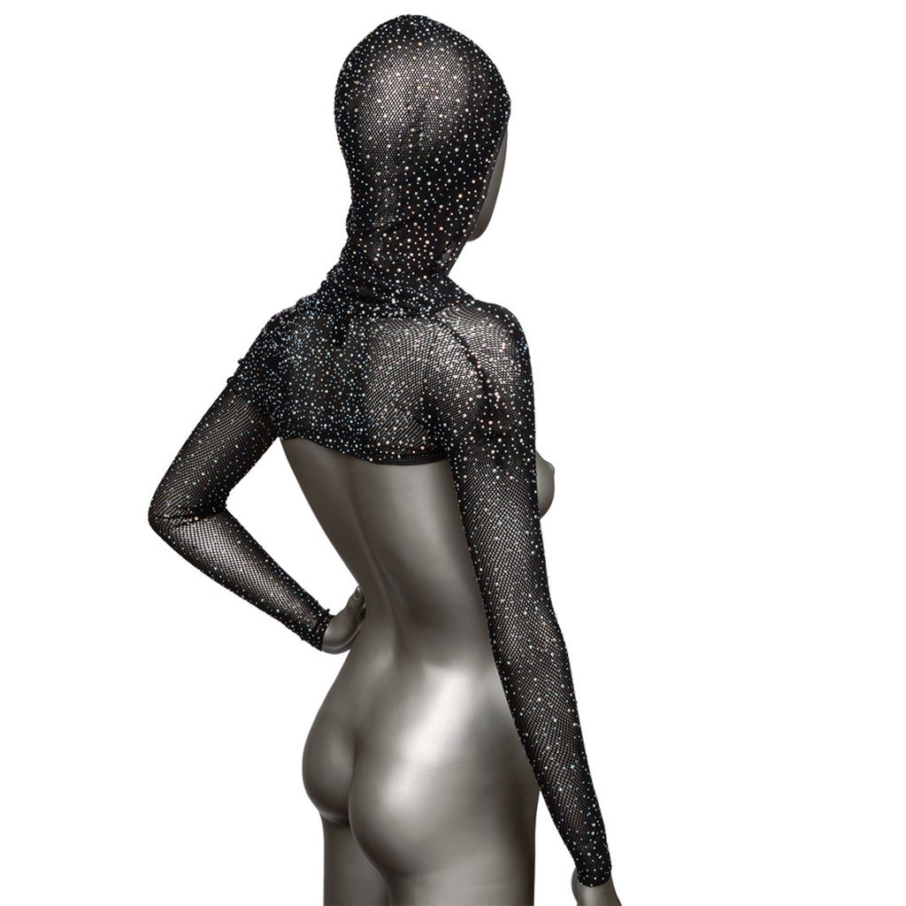 Soft and stretchy, this sparkly, rhinestone and mesh beauty features long sleeves, a mysterious hood, and a tiny back panel ideal for backless dresses and various lingerie accoutrements.