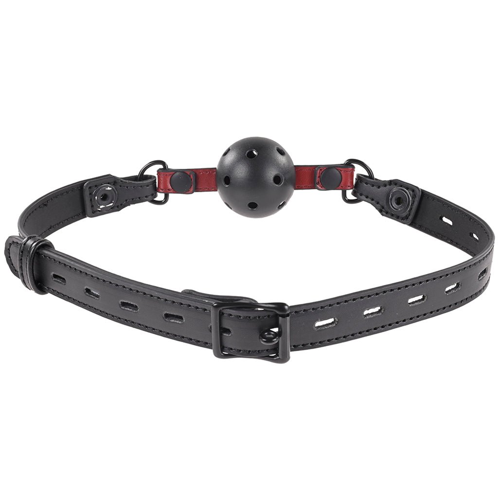Easily interchanged on a signature Saffron black and red vegan leather strap, the 1.75″/4.4 cm perforated plastic ball and 2.1″/5.3cm ring snaps on or off in a jiff, ready to accommodate all your playful gagging needs! The band buckles up tight – keep in mind that the tighter the band, the tighter the gag against their lips, so there’s some room for customization there.