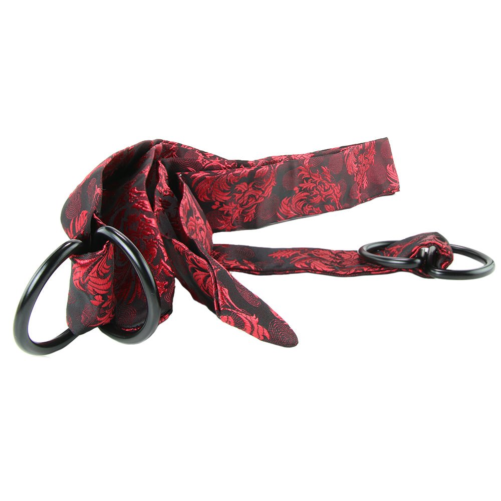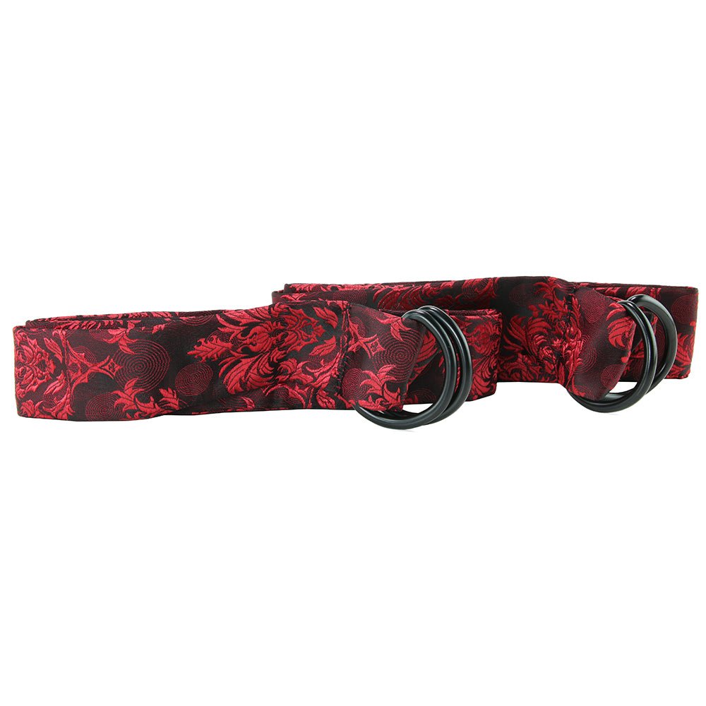 Two lovely red and black brocade fabric tie straps feature lots of length for wrapping and knotting around chair arms and legs as well as a simple cinch design to slip over wrists or ankles. Both 60″ (152.5cm) ties are comfortably padded and securely double stitched.