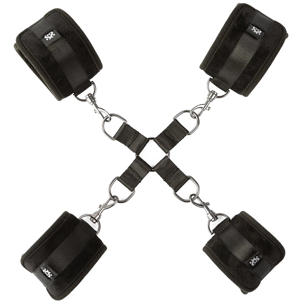 If you want soft and easily adjustable, Hog Tied is for you! A cross strap holds tight to four comfy padded Cuffs; you can place it in front or behind them. Each Cuff is adjustable size-wise (all close with simple velcro) and features sturdy swivel clips for quick hook-ups.