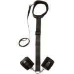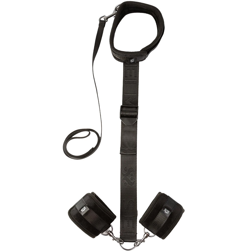 This creative set-up includes a soft vertical body strap connecting two super-soft, adjustable cuffs and a collar. You’ll use it to trap their hands behind their back (or vice versa) for full, sexily vulnerable chest access. Keep the little leash clipped for extra control!
