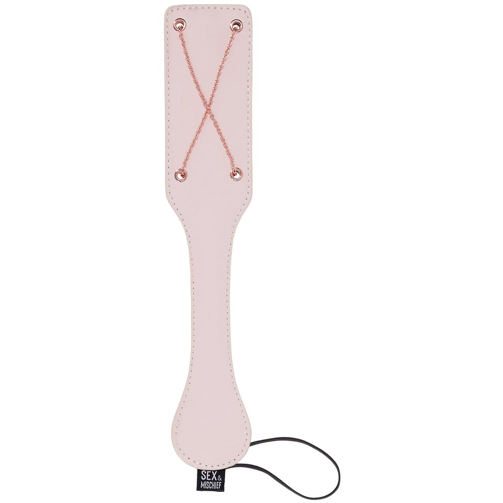 One side is all about bite, with gleaming rose gold chains that crisscross to leave their mark—because X always marks the spot. Flip it over for a smoother, chain-lined surface when you’re in the mood for teasing taps instead of stinging snaps.