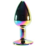 We have to mention the Small’s absolutely gorgeous color scheme, too. Rainbow hues from blue and purple to gold and yellow swirl and twirl together for a totally unique oil slick effect. Pair that with the pink jewel and you’ve got one fantastic looking butt plug!