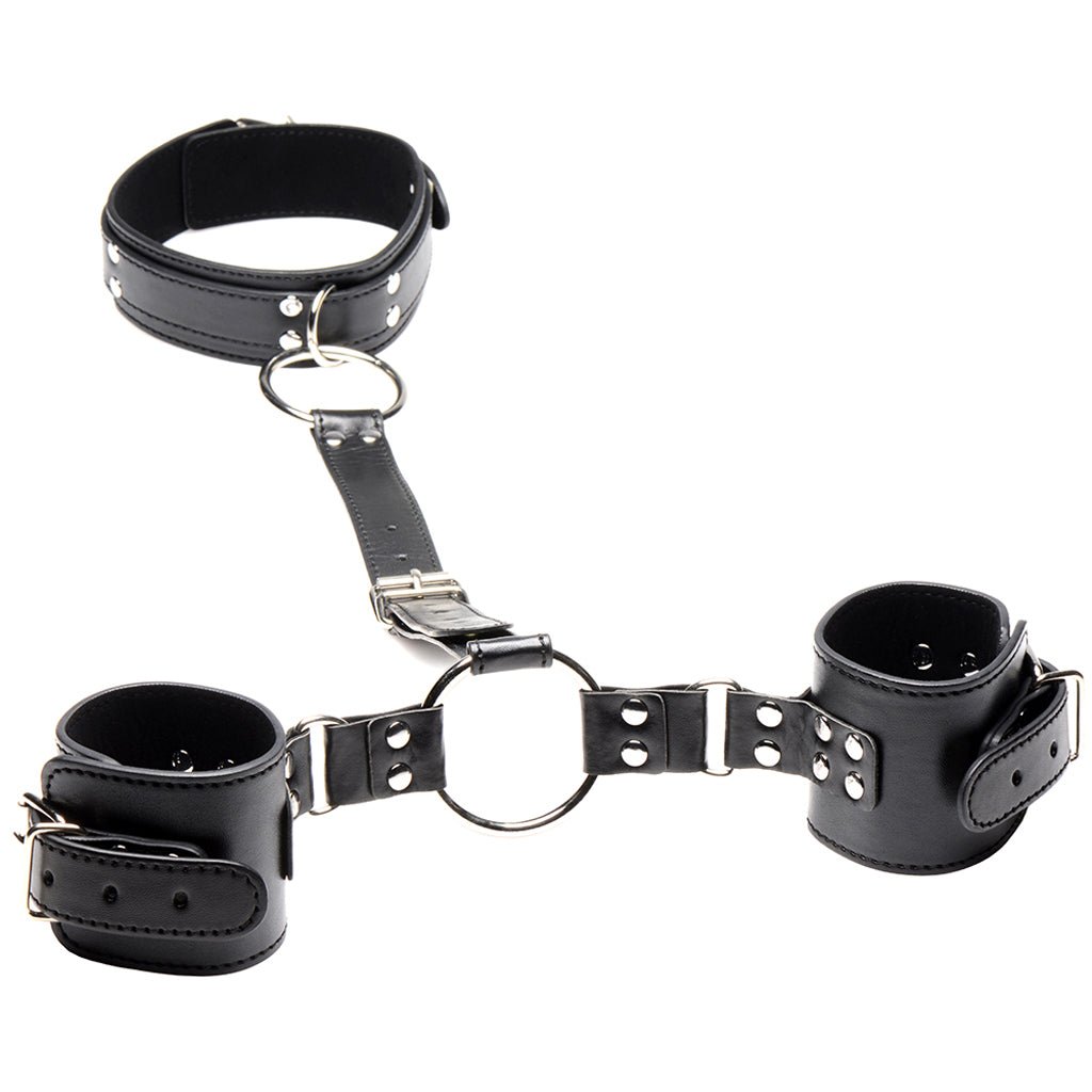 In vegan friendly leather, the Neck to Wrist Restraints should be spot-cleaned as needed.