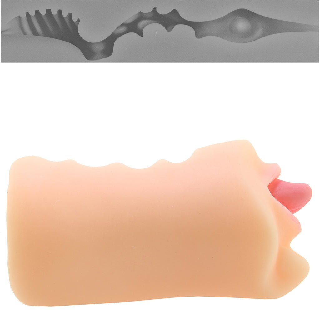Starting off with a perfect replica of a soft mouth, the plushy, squeezable interior is bouncy and clingy, gripping tight all the way through a multi-textured tunnel. Cover up the open back end with a finger if you or your partner is craving more suction.